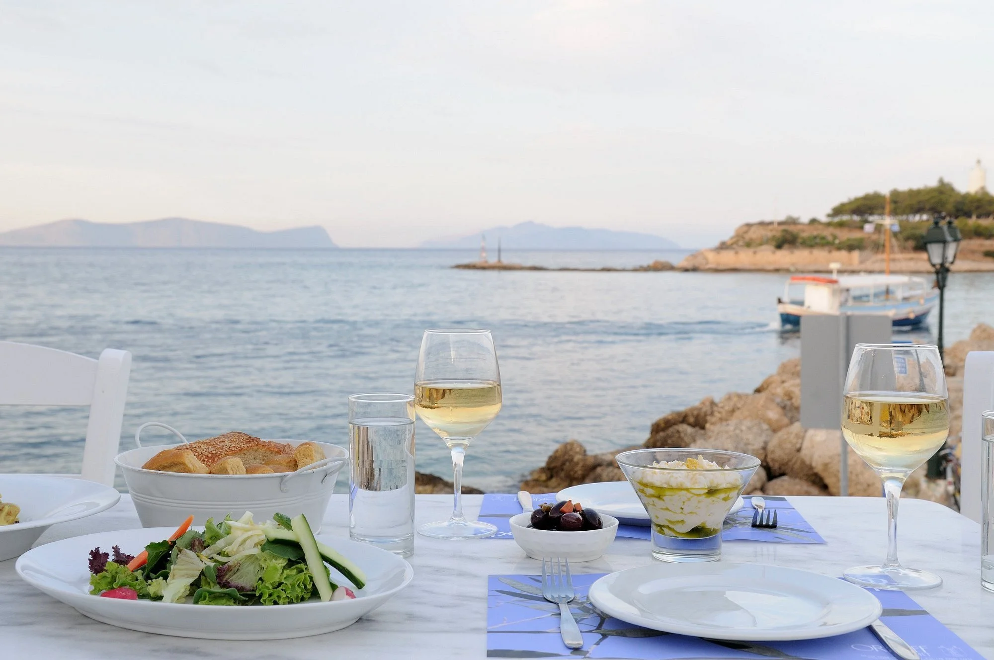 Grilled fish with lemon, Spetses-style fish stew, local honey, herbs, and chilled rosΓ© at sunset.